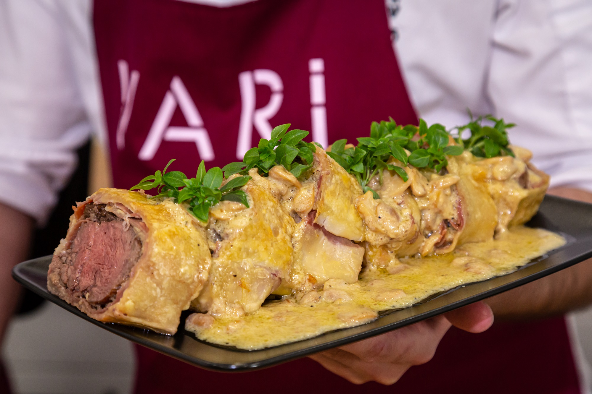 - Готовый Веллингтон остудить 10-15 минут, а затем нарезать на порционные куски. Подавать со сливочно-грибным соусом и зеленью.
