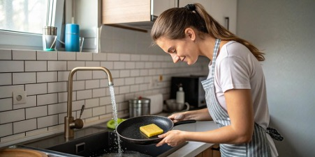 После готовки давайте посуде остыть. Никогда не заливайте горячую сковороду холодной водой — это может привести к деформации.