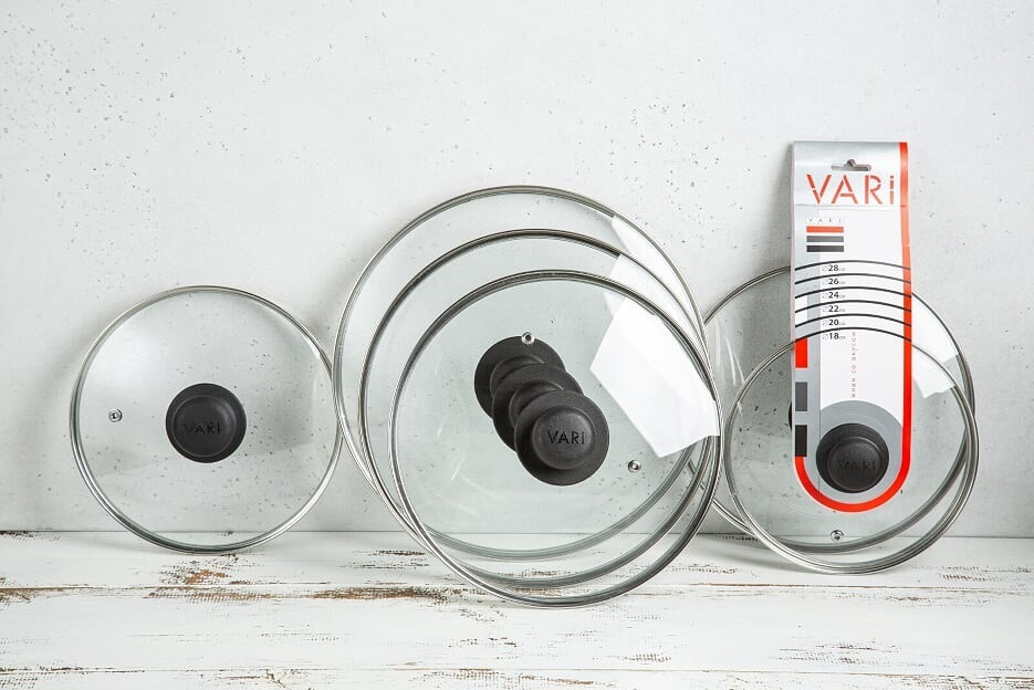 Крышка из термостойкого стекла, с металлическим ободом, выполненным из высококачественной нержавеющей стали, с отверстием для выхода пара. Обод защищает крышку от повреждений. Все крышки сделаны из жаропрочного стекла с термостойкими бакелитовыми ручками. Можно мыть в посудомоечной машине.