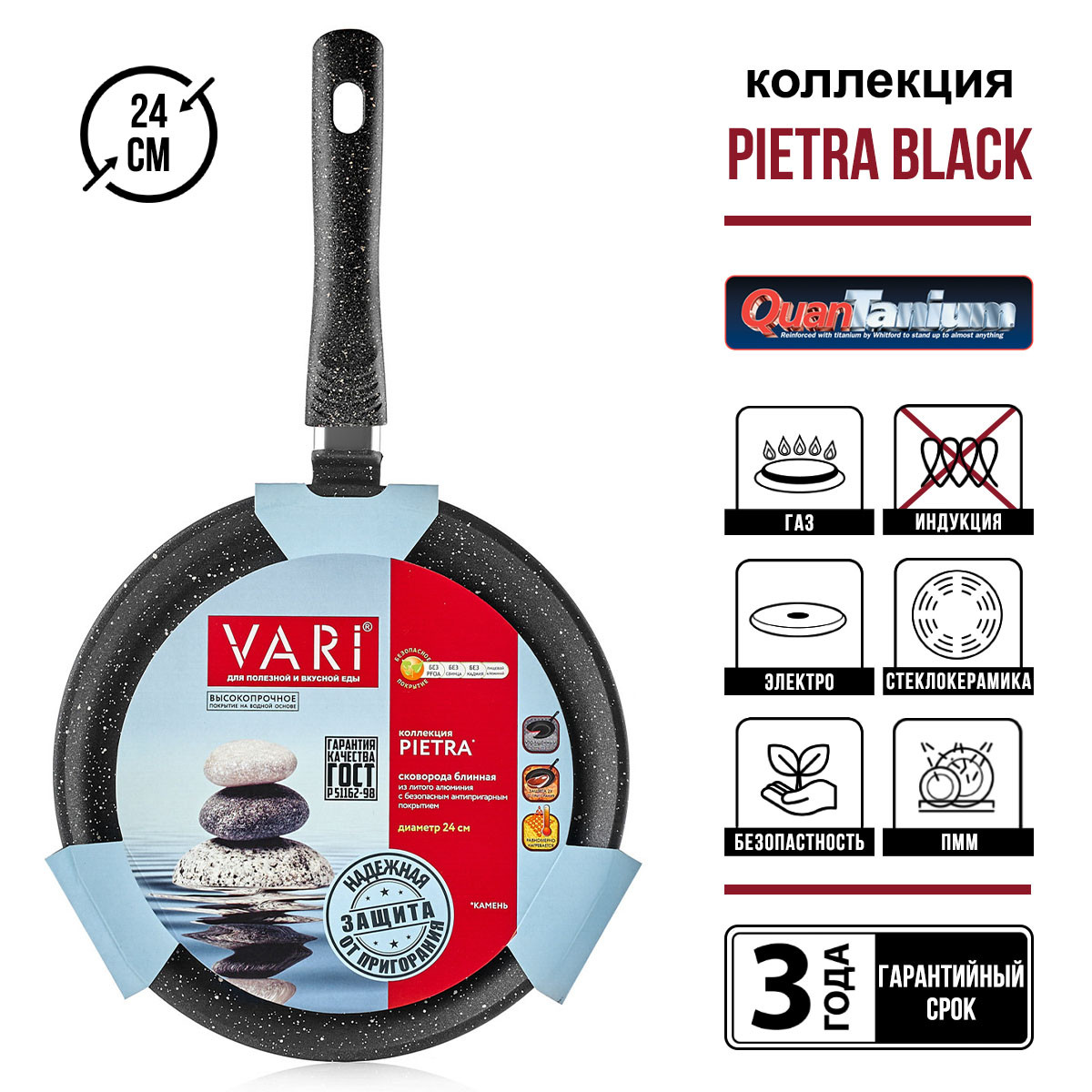 Блинная сковорода 24см PIETRA изготовлена из литого алюминия, имеет высокие антипригарные свойства, устойчивость к царапинам и истиранию. Вы можете использовать металлические лопатки и другие аксессуары без какого-либо ущерба для покрытия. Качественное антипригарное покрытие Whitford Quantanium нанесено в три слоя и не допускает пригорания продуктов, позволяя готовить без масла. Покрытие не содержит PFOA (перфтороктановую кислоту), поэтому безопасно для человека. Сковорода изготовлена из толстостенного алюминия, который быстро раскаляется и долго держит тепло. Массивное дно равномерно распределяет жар по всей поверхности и обеспечивает равномерную прожарку. С наружной стороны сковороды нанесено жаростойкое силиконовое покрытие, предохраняющее стеклокерамическую плиту от повреждений и загрязнений. Ручка не нагревается, не скользит в руке. Изделие подходит для газовых, электрических и стеклокерамических плит. После использования можно мыть в посудомоечной машине.