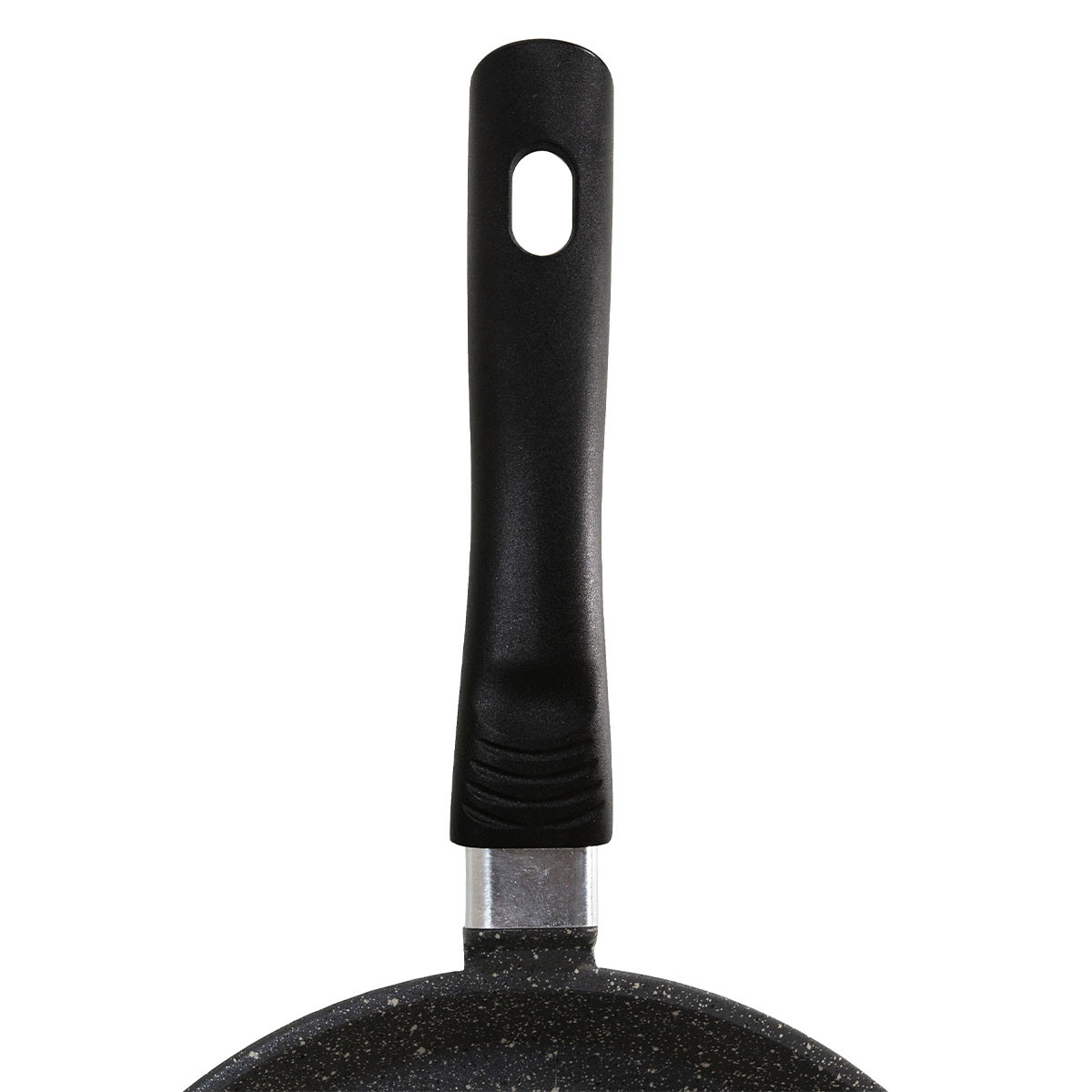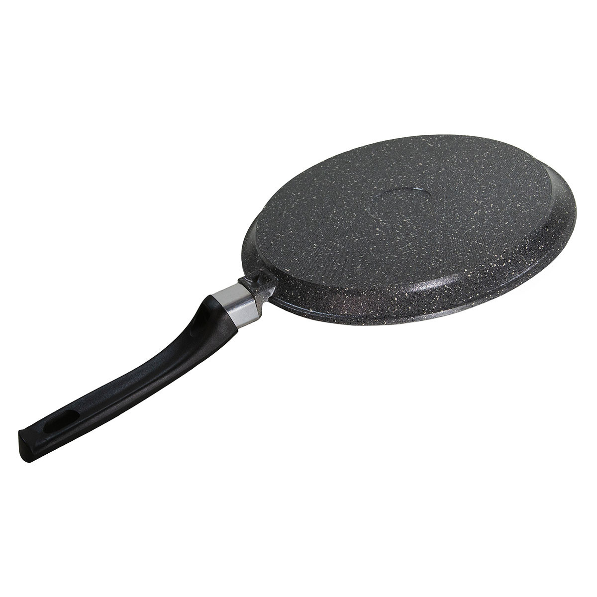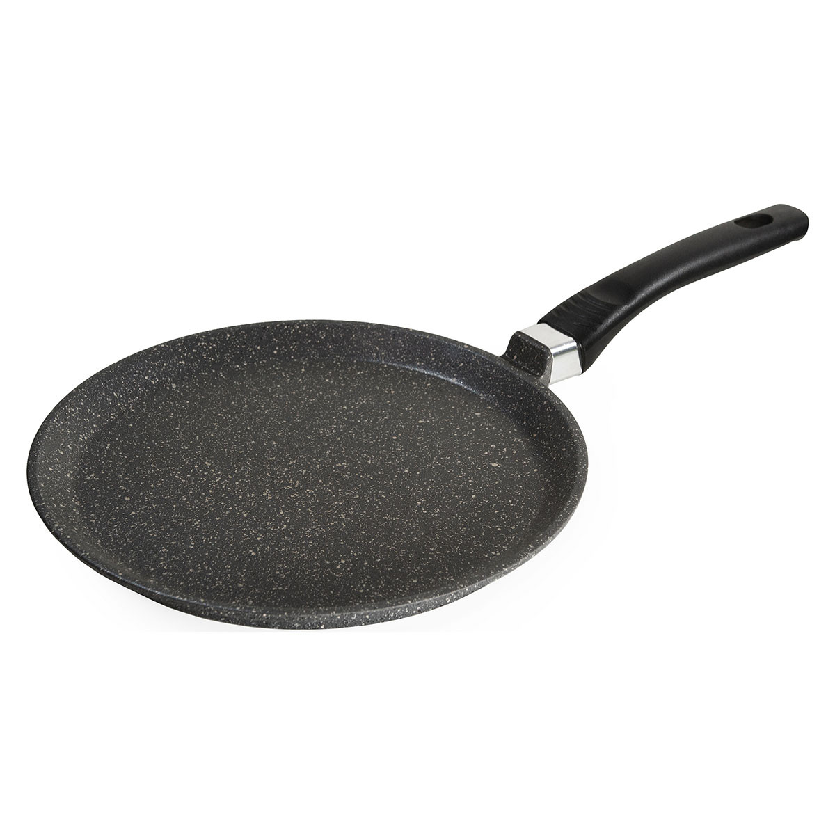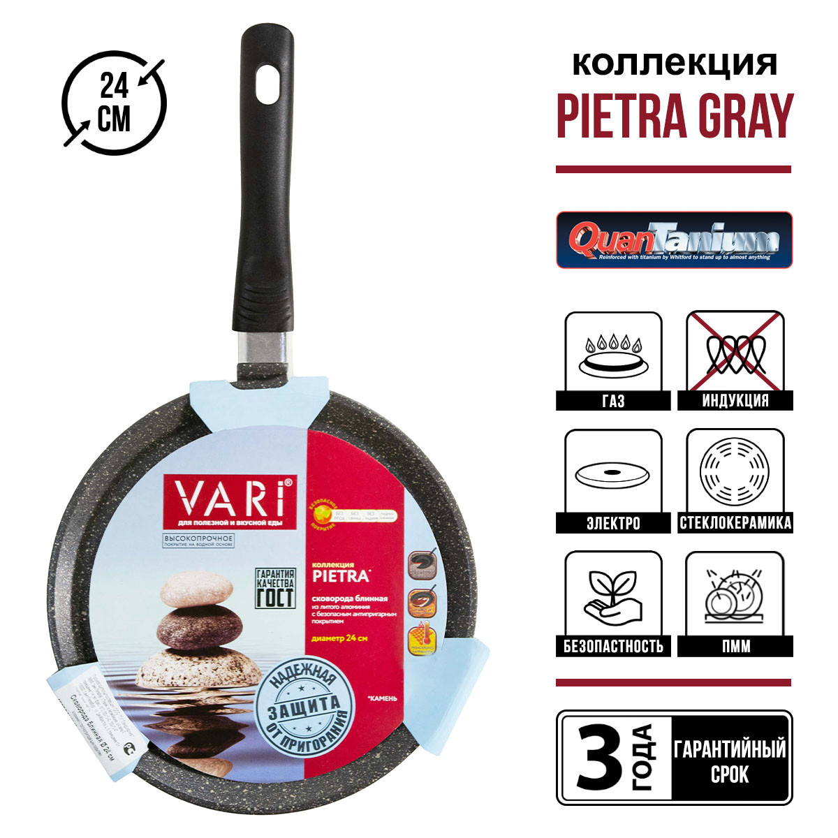 Блинная сковорода 24см PIETRA изготовлена из литого алюминия, имеет высокие антипригарные свойства, устойчивость к царапинам и истиранию. Вы можете использовать металлические лопатки и другие аксессуары без какого-либо ущерба для покрытия. Качественное антипригарное покрытие Whitford Quantanium нанесено в три слоя и не допускает пригорания продуктов, позволяя готовить без масла. Покрытие не содержит PFOA (перфтороктановую кислоту), поэтому безопасно для человека. Сковорода изготовлена из толстостенного алюминия, который быстро раскаляется и долго держит тепло. Массивное дно равномерно распределяет жар по всей поверхности и обеспечивает равномерную прожарку. С наружной стороны сковороды нанесено жаростойкое силиконовое покрытие, предохраняющее стеклокерамическую плиту от повреждений и загрязнений. Ручка не нагревается, не скользит в руке. Изделие подходит для газовых, электрических и стеклокерамических плит. После использования можно мыть в посудомоечной машине.