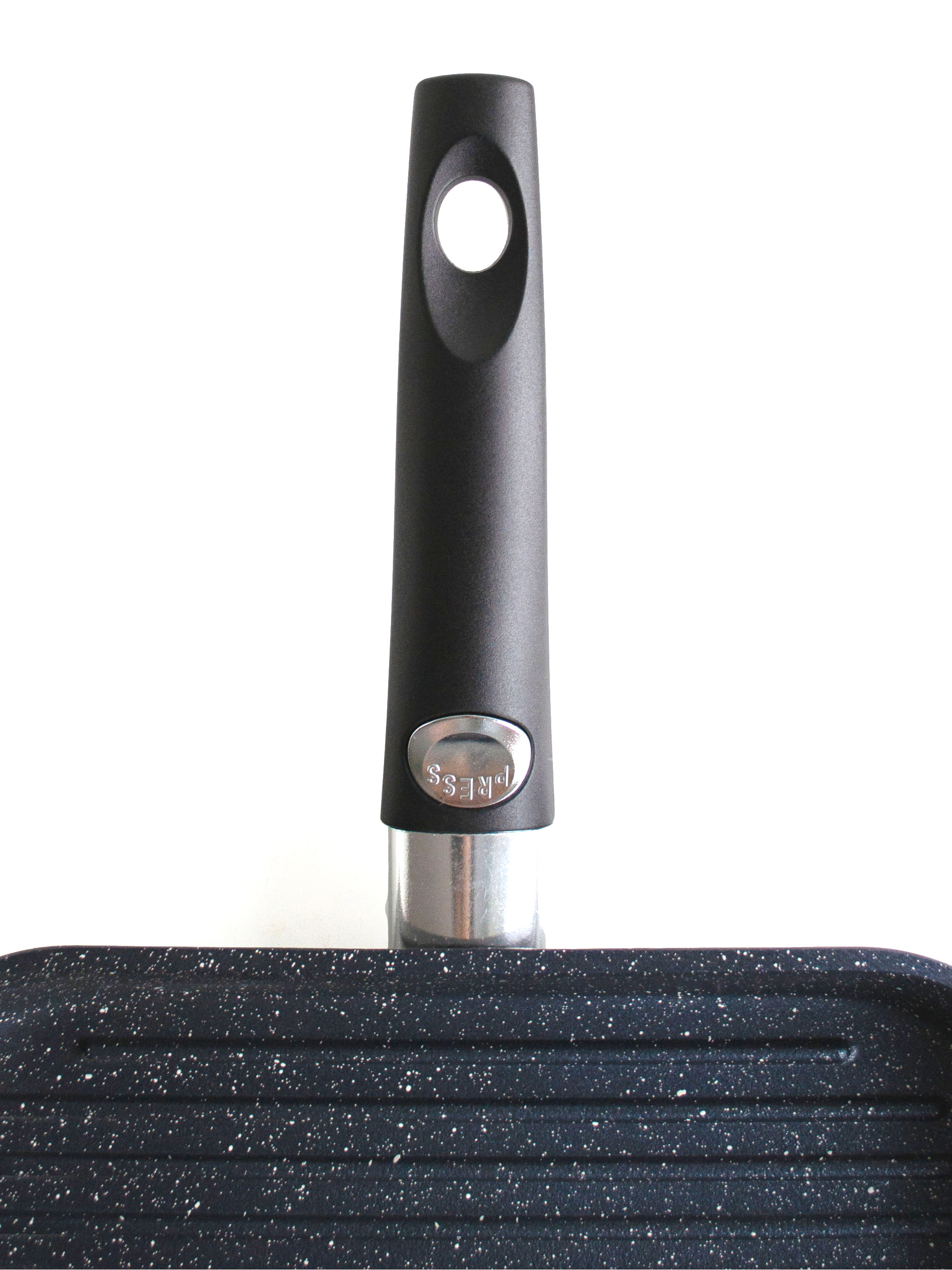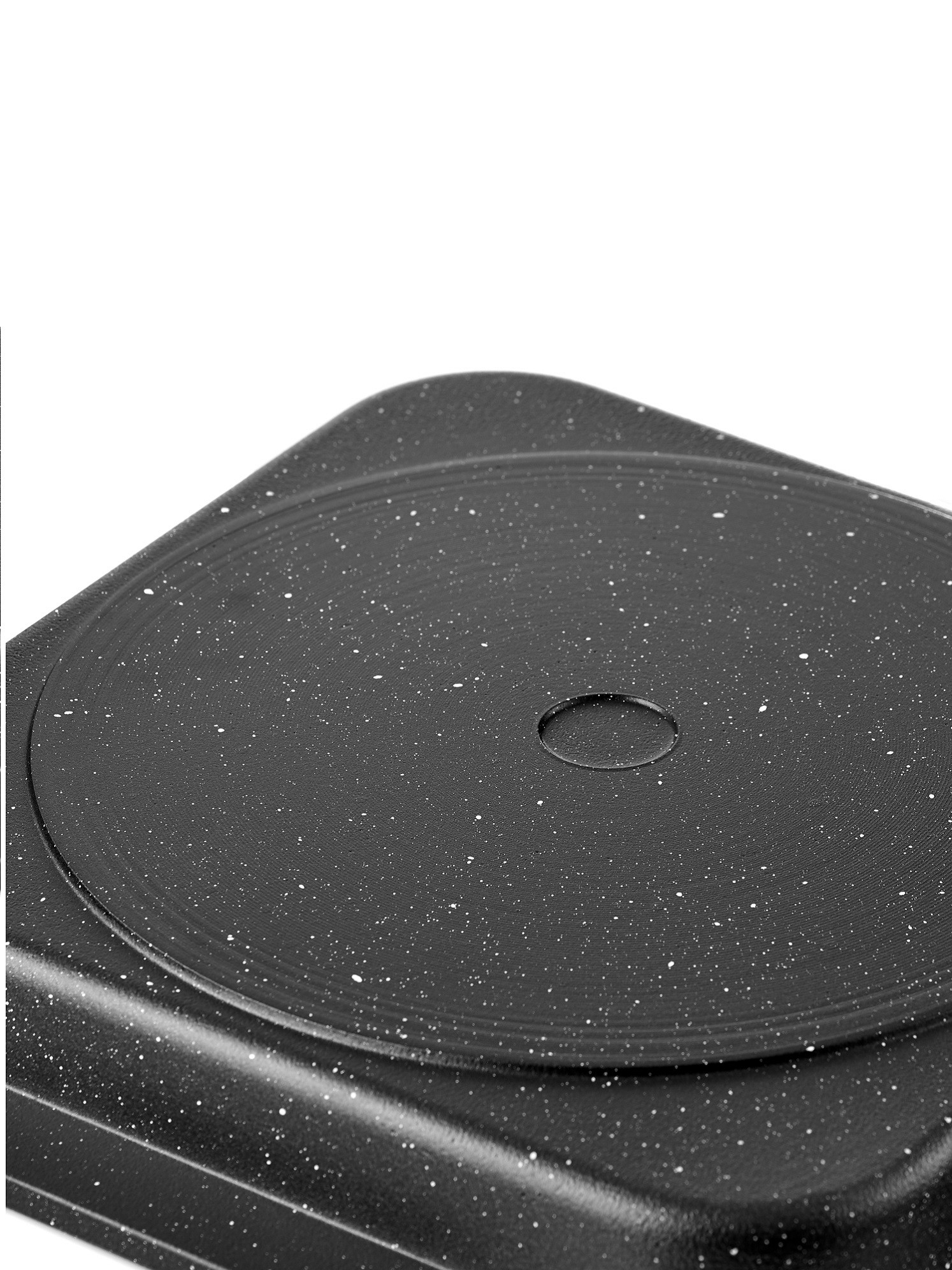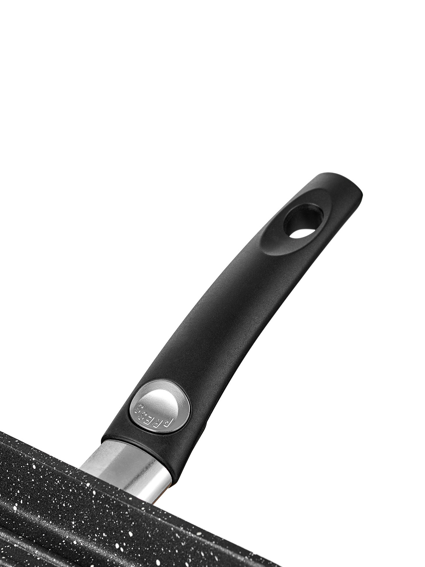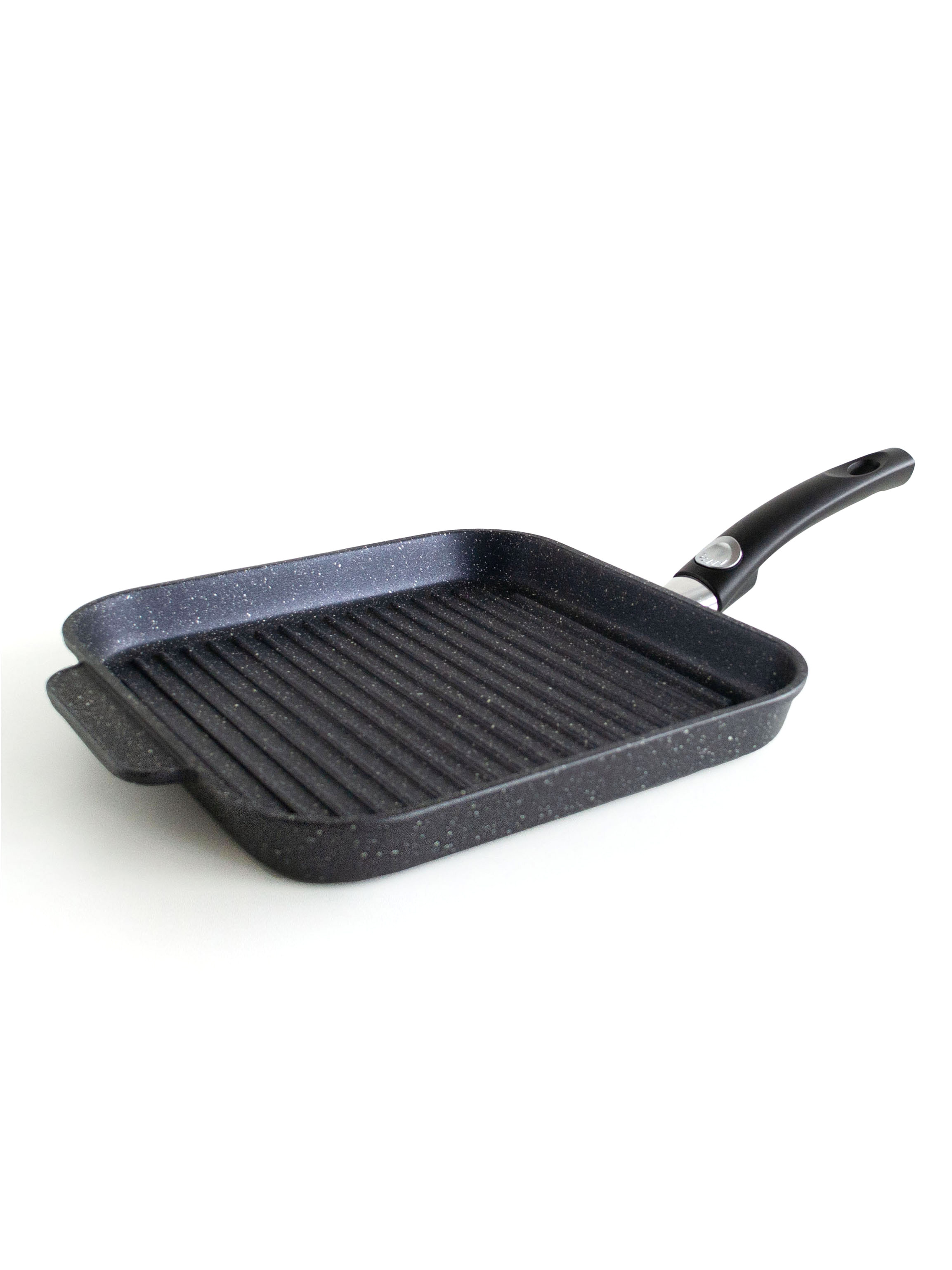 Сковорода-гриль 28см PIETRA квадратной формы изготовлена из литого алюминия, имеет высокие антипригарные свойства, устойчивость к царапинам и истиранию. Вы можете использовать металлические лопатки и другие аксессуары без какого-либо ущерба для покрытия. Качественное антипригарное покрытие Quantanium нанесено в три слоя и не допускает пригорания продуктов, позволяя готовить без масла. Покрытие не содержит PFOA, поэтому безопасно для человека. Сковорода изготовлена из толстостенного алюминия, который быстро раскаляется и долго держит тепло. Массивное дно равномерно распределяет жар по всей поверхности и обеспечивает равномерную прожарку. С наружной стороны сковороды нанесено жаростойкое силиконовое покрытие, предохраняющее стеклокерамическую плиту от повреждений и загрязнений. Съемная ручка Soft Touch не нагревается, не скользит в руке и допускает использование в духовом шкафу. Изделие подходит для газовых, электрических и стеклокерамических плит. Можно мыть в посудомоечной машине.
