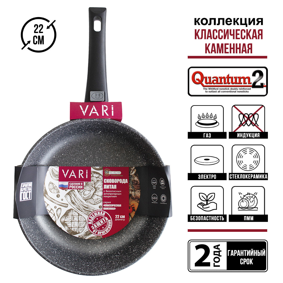 Серия литой посуды «Классическая каменная» (серый цвет). Универсальный литой корпус с высокими и скошенными бортами. Пища равномерно обжаривается, не пригорает на дне, удобно перемешивать. Двухслойное усиленное антипригарное покрытие Quantum2®.