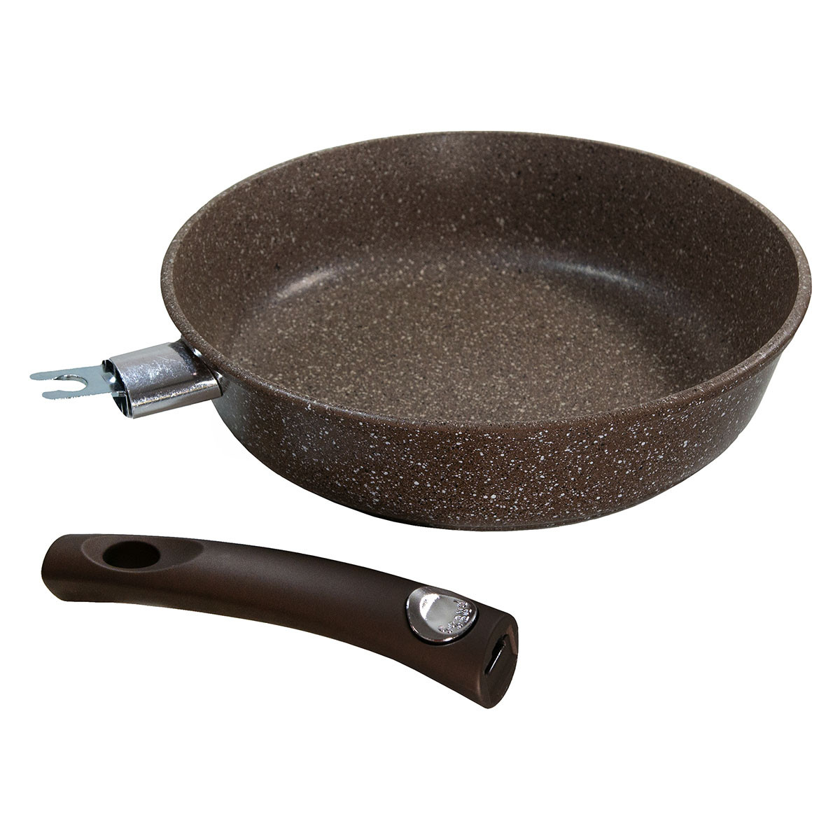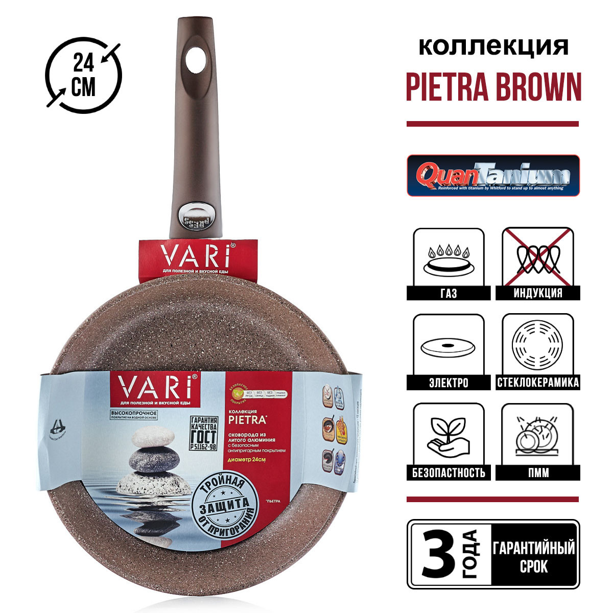 Сковорода со съемной ручкой 24см изготовлена из литого алюминия, имеет высокие антипригарные свойства, устойчивость к царапинам и истиранию. Допускается использование металлических лопаток и других аксессуаров без ущерба для покрытия. Качественное антипригарное покрытие Quantanium нанесено в три слоя и не допускает пригорания продуктов, позволяя готовить без масла. Покрытие не содержит PFOA (перфтороктановую кислоту), поэтому безопасно для человека. Изделие изготовлено из толстостенного алюминия, который быстро раскаляется и долго держит тепло. Массивное дно равномерно распределяет жар по всей поверхности, обеспечивая равномерную прожарку. С наружной стороны сковороды нанесено жаростойкое силиконовое покрытие, предохраняющее стеклокерамическую плиту от повреждений и загрязнений. Съемная ручка Soft Touch не нагревается, не скользит в руке. Толщина стенки 4,5 мм; дна 6 мм. Изделие подходит для газовых, электрических и стеклокерамических плит. Можно мыть в посудомоечной машине.