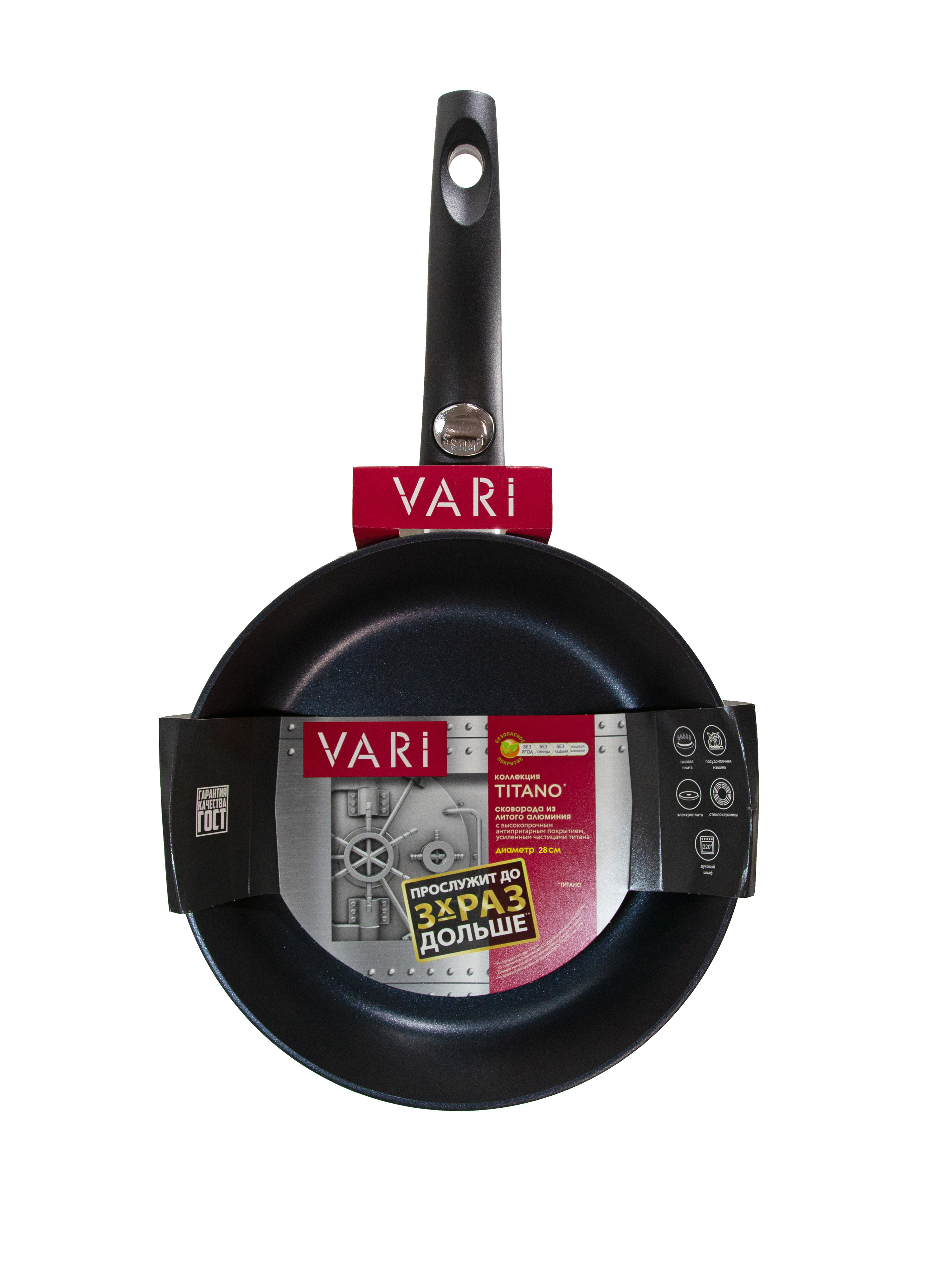 Универсальная сковорода 28см со съемной ручкой. Надежная, как банковский сейф. Сковорода серии «TITANO» с многослойным антипригарным покрытием QuanTanium, которое дает возможность нагреть посуду до более высокой температуры, что позволяет сразу зажарить продукты до хрустящей корочки, а потом потомить до готовности. Покрытие усилено частицами титана, которые обеспечивают высокую стойкость к царапинам и истиранию, даже при частом использовании