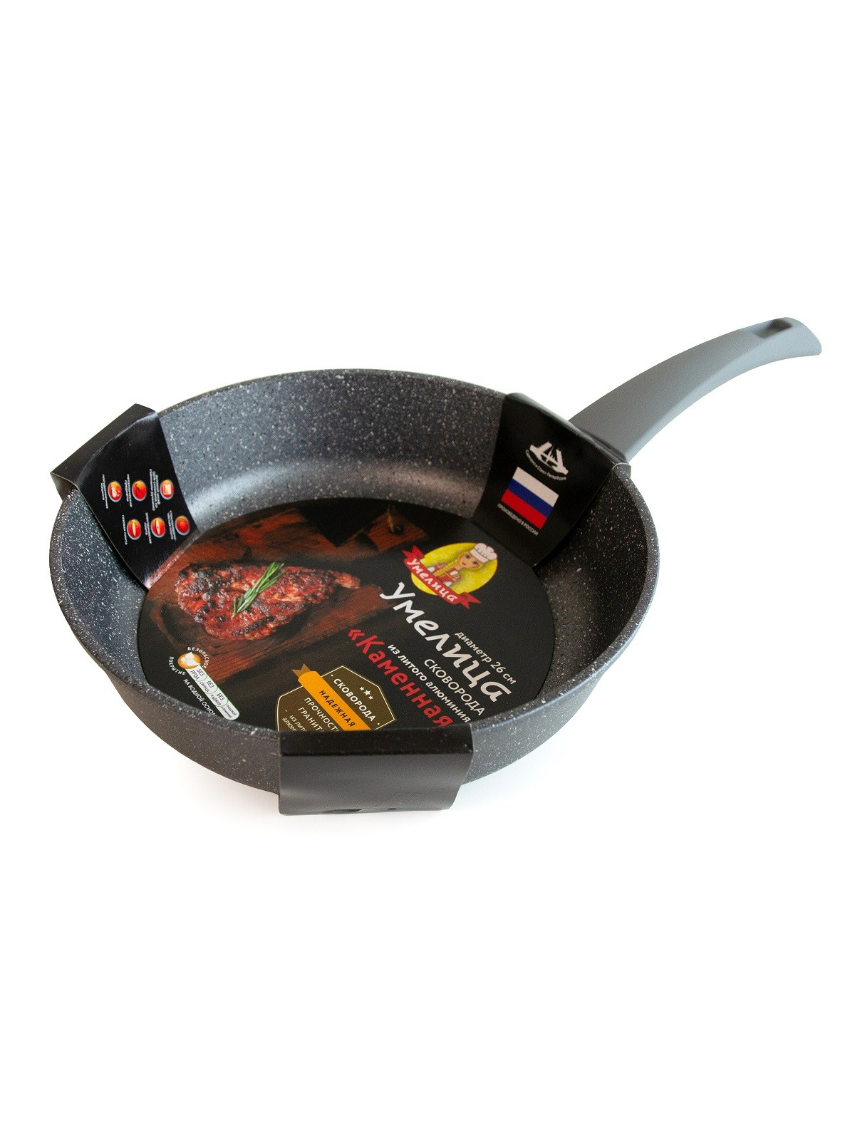 Сковорода серии «Умелица каменная» имеет утолщенный корпус, позволяющий равномерно распределять и аккумулировать тепло. Антипригарное покрытие QuanTanium с внешним декоративным эффектом камня и повышенной стойкостью к повреждениям, которая достигается за счет сверхтвердых частиц, армированных в слои покрытия. Покрытие обладает высокой стойкостью к истиранию. При приготовлении можно использовать не острые металлические лопатки. Отличные антипригарные свойства позволяют готовить блюда без добавления масла и жиров. Покрытие на водной основе, не содержит PFOA, свинца и кадмия, поэтому безопасно для человека. Толщина стенки 4,5 мм; дна 6 мм. Подходит для газовых, электрических, стеклокерамических плит. Ручки с мягким покрытием Soft-Touch, не нагреваются не скользят в руке. Подходит для посудомоечных машин. Изготовлена по ГОСТ.