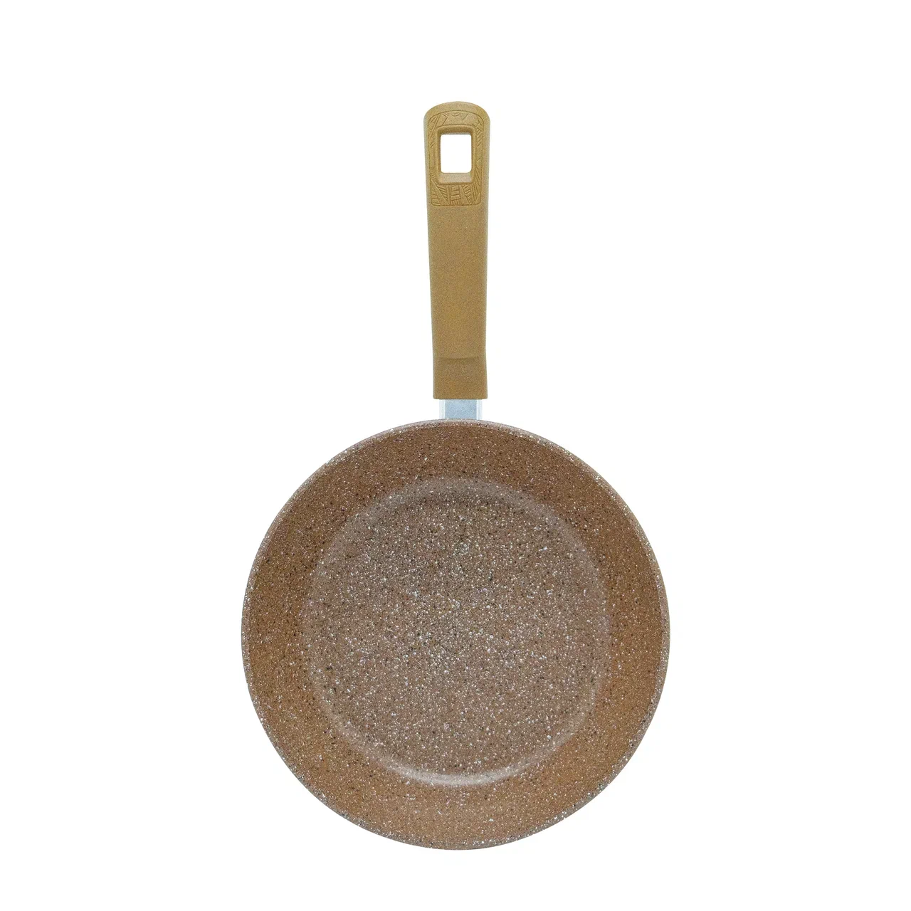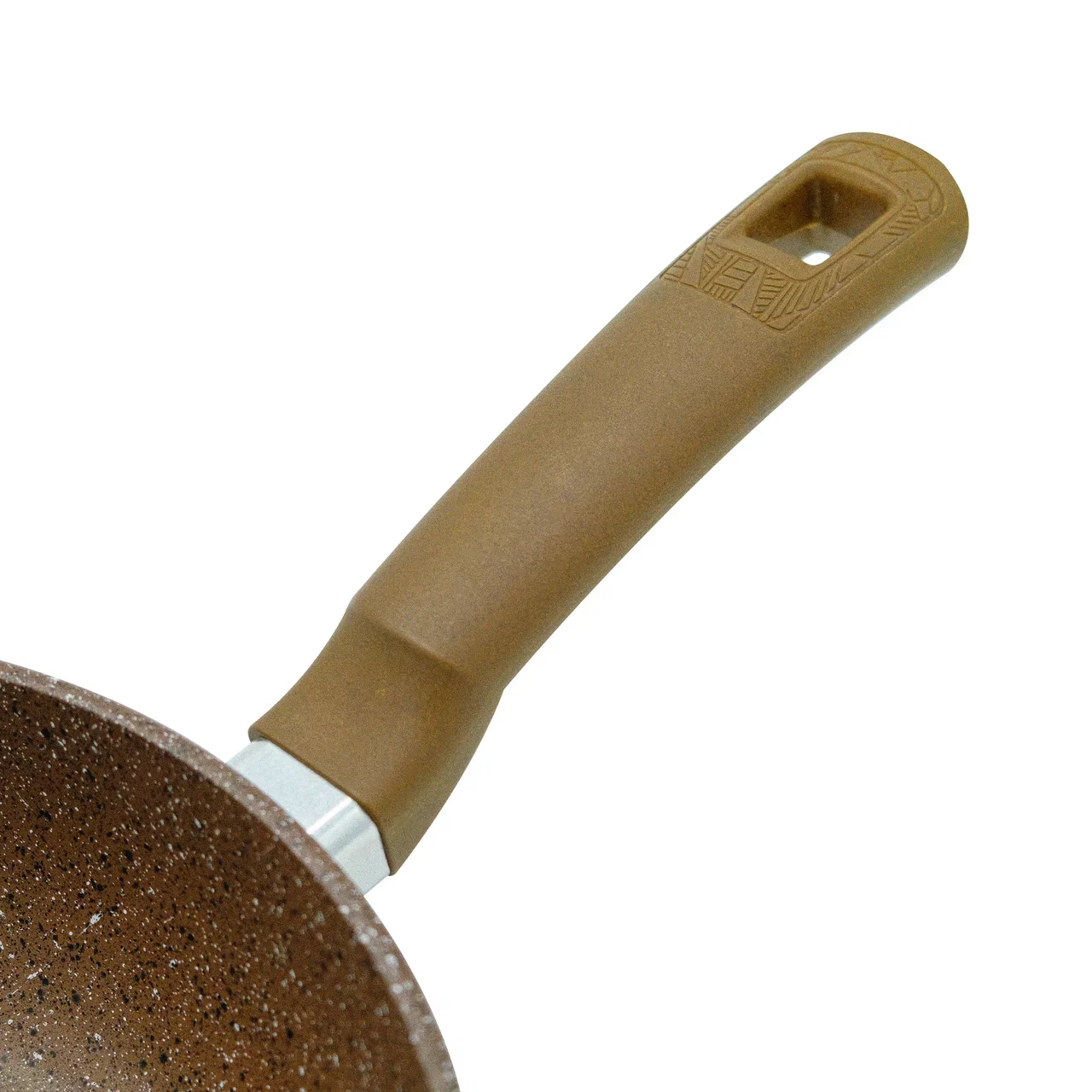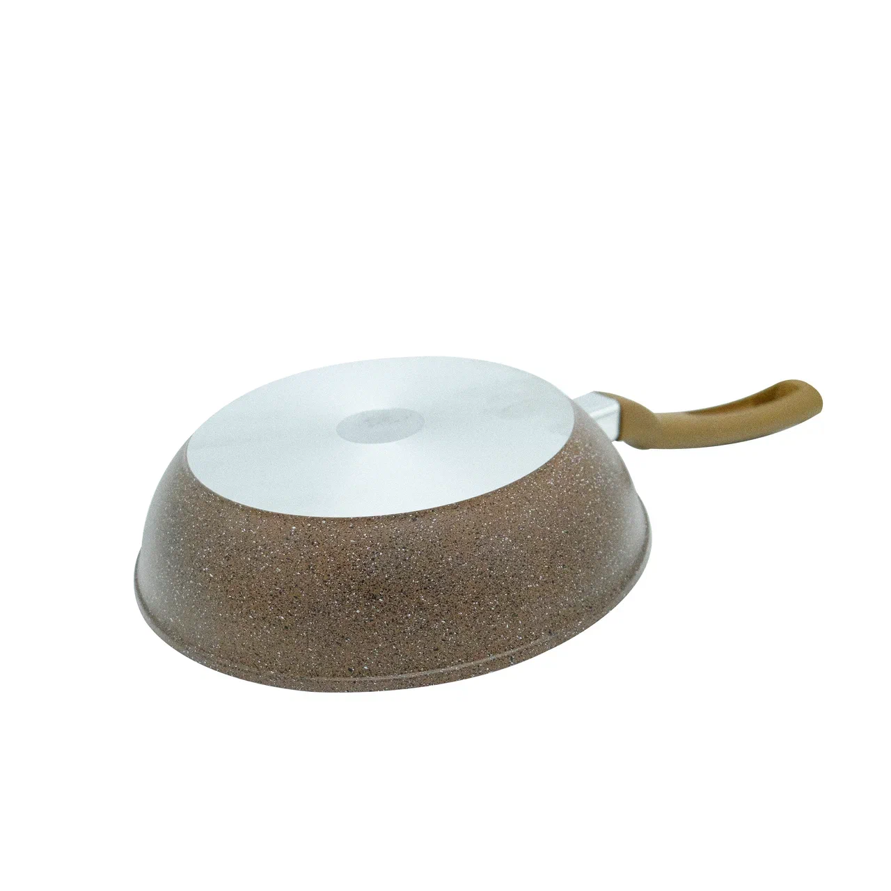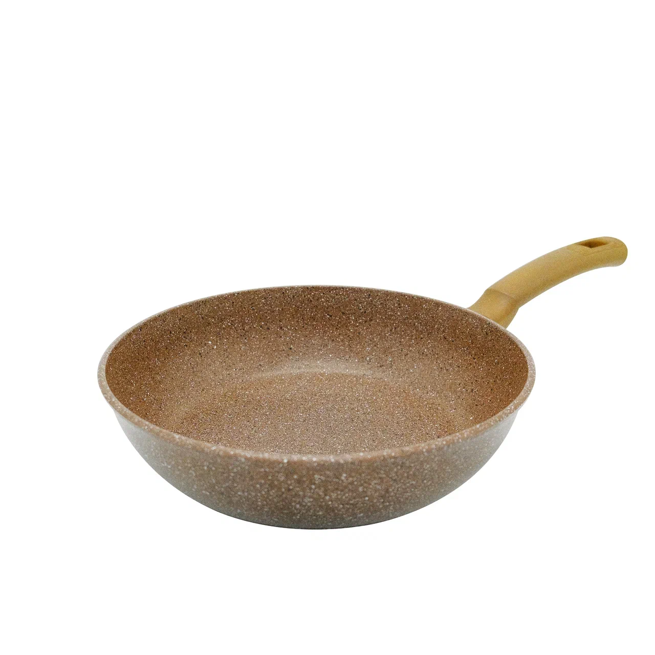 Серия литой посуды «Классическая каменная» (коричневый цвет). Универсальный литой корпус с высокими и скошенными бортами. Пища равномерно обжаривается, не пригорает на дне, удобно перемешивать. Двухслойное усиленное антипригарное покрытие Quantum2®.