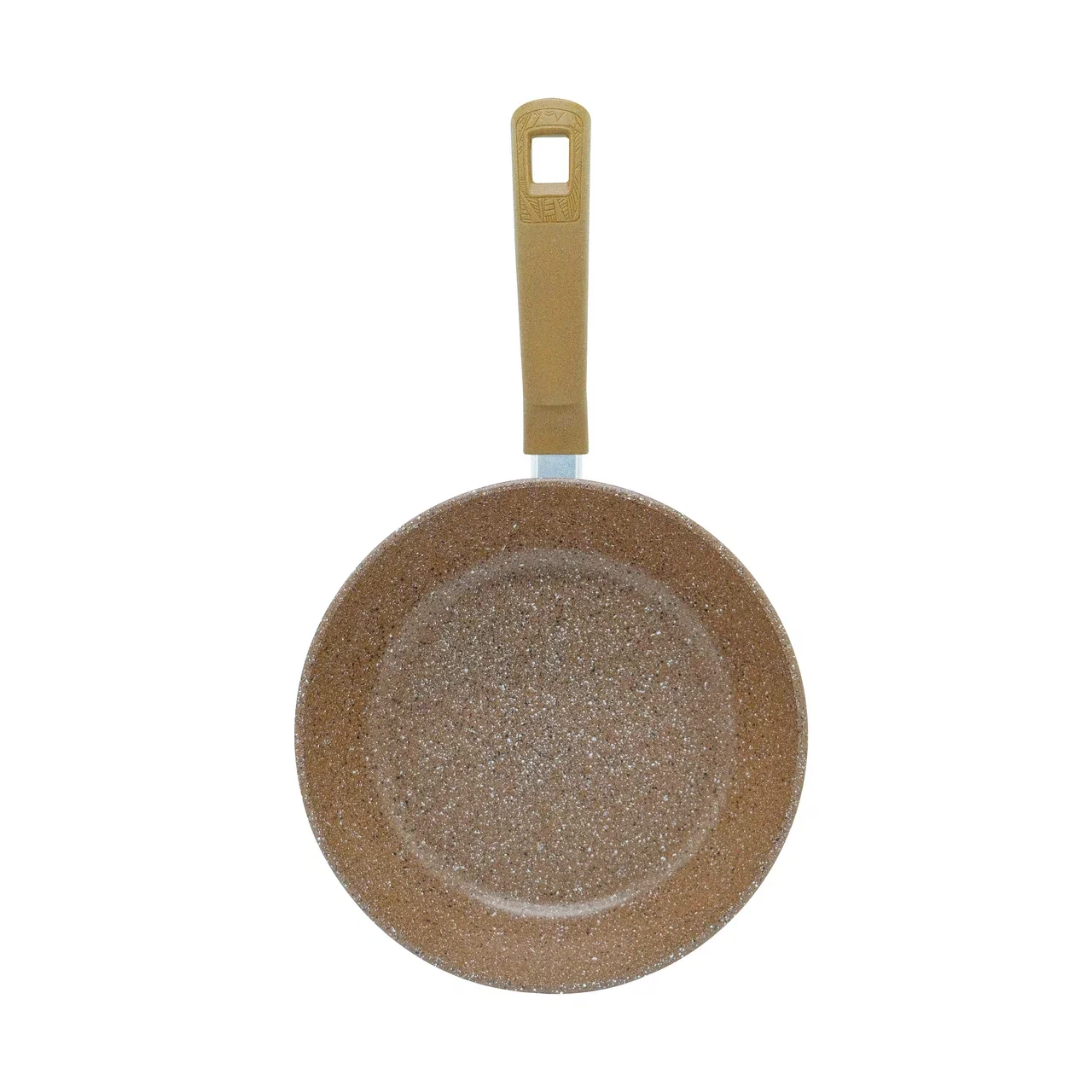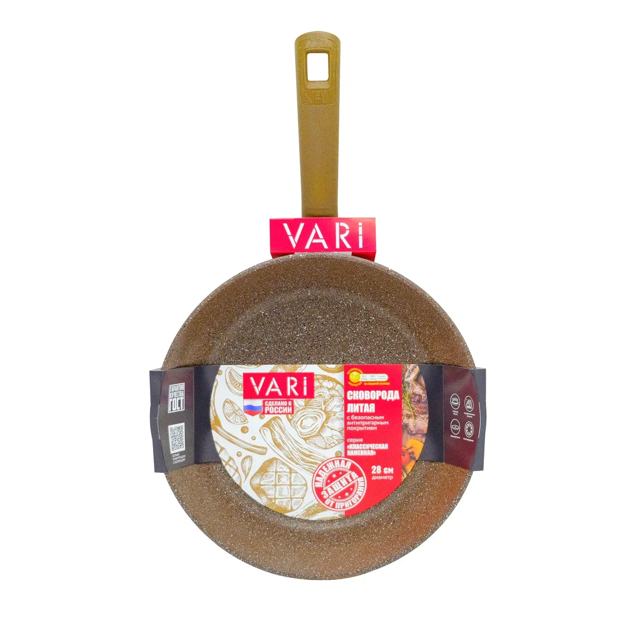 Серия литой посуды «Классическая каменная» (коричневый цвет). Универсальный литой корпус с высокими и скошенными бортами. Пища равномерно обжаривается, не пригорает на дне, удобно перемешивать. Двухслойное усиленное антипригарное покрытие Quantum2®.