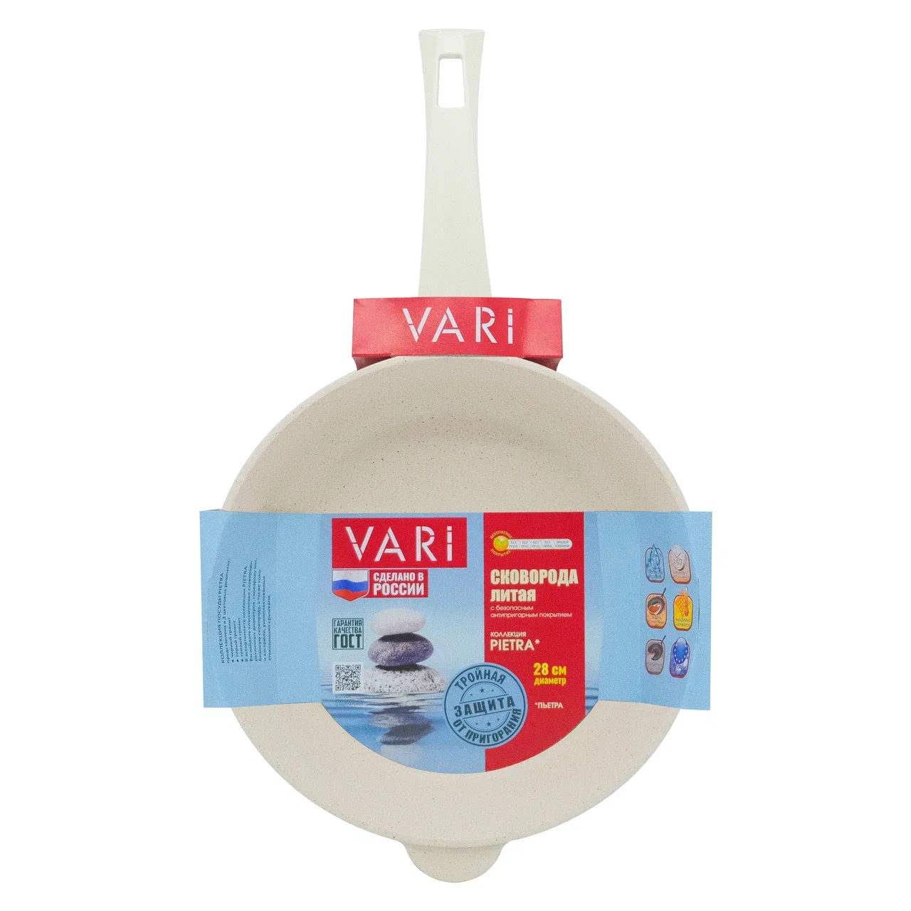 Сковорода PIETRA изготовлена из литого алюминия, имеет высокие антипригарные свойства, устойчивость к царапинам и истиранию. Вы можете использовать металлические лопатки и другие аксессуары без какого-либо ущерба для покрытия. Качественное антипригарное покрытие нанесено в три слоя и не допускает пригорания продуктов, позволяя готовить без масла. Покрытие не содержит PFOA (перфтороктановую кислоту), поэтому безопасно для человека. Сковорода изготовлена из толстостенного алюминия, который быстро раскаляется и долго держит тепло. Массивное дно равномерно распределяет жар по всей поверхности и обеспечивает равномерную прожарку. С наружной стороны сковороды нанесено жаростойкое силиконовое покрытие, предохраняющее стеклокерамическую плиту от повреждений и загрязнений. Ручка не нагревается, не скользит в руке. Изделие подходит для газовых, электрических и стеклокерамических плит. После использования можно мыть в посудомоечной машине.