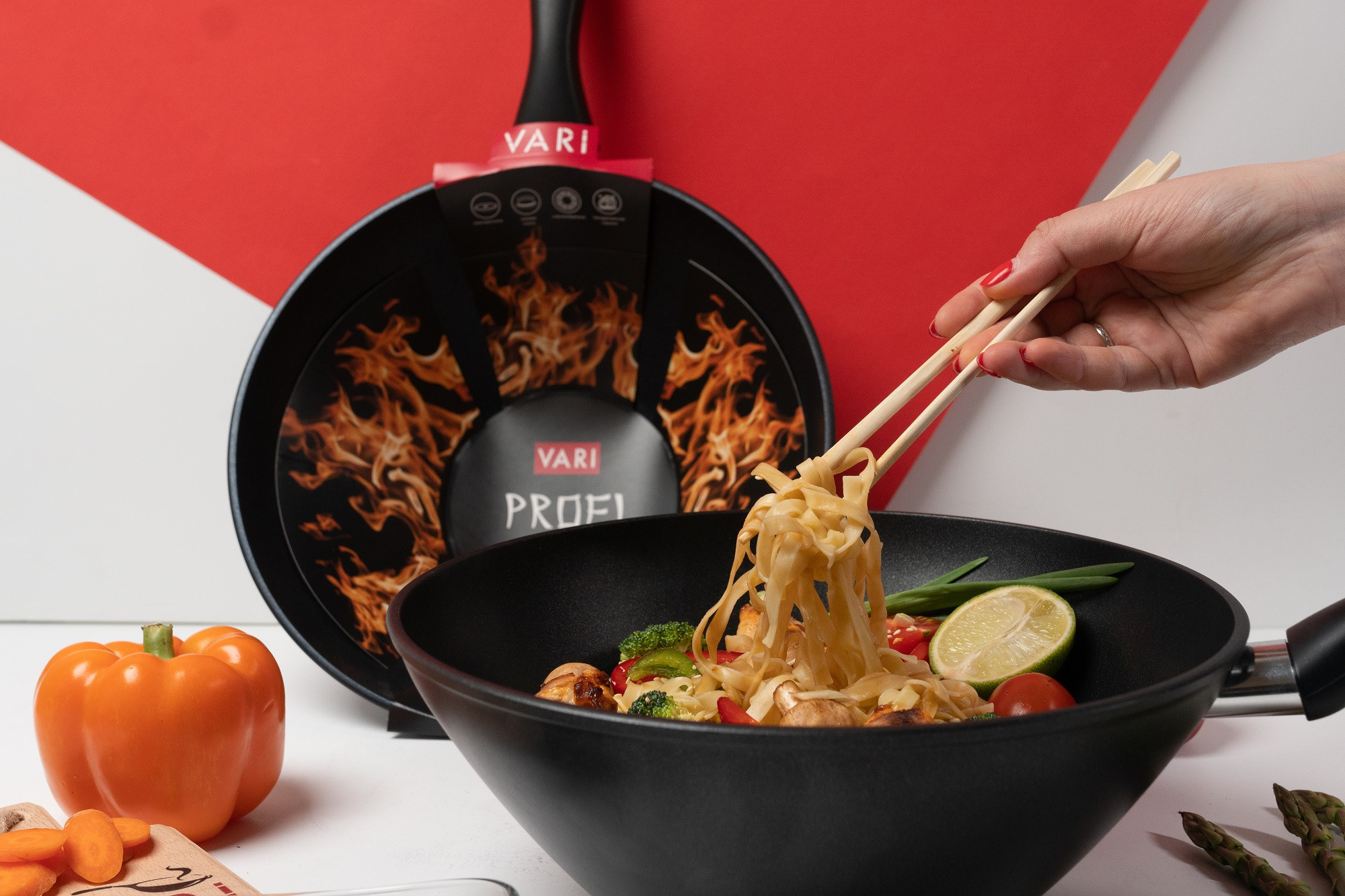 Profi WOK 28см имеет уникальную форму, которая совмещает в себе особенную форму WOK и удобство устойчивого дна сковороды.