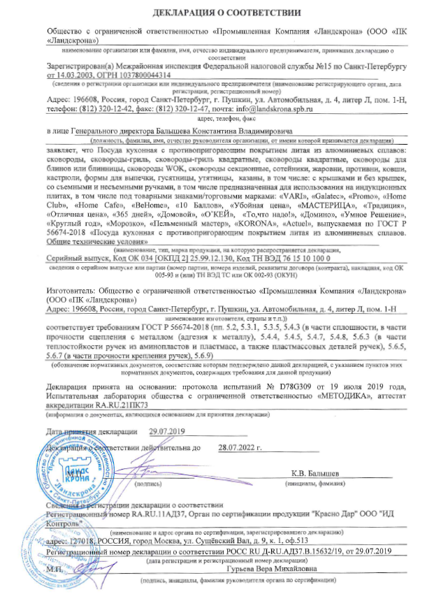 Сертификат соответствия – документ, подтверждающий соответствие продукции требованиям качества и безопасности, установленными для нее действующими стандартами и правилами (ГОСТ, ГОСТ Р, ГОСТ Р МЭК, ТУ, Технический регламент и пр.). Декларация соответствия требованиям качества по литой посуде