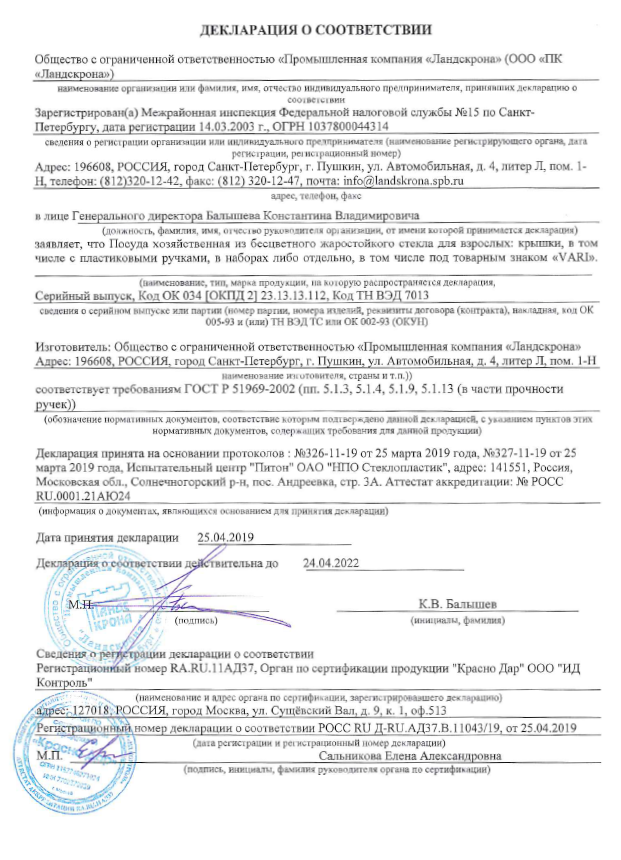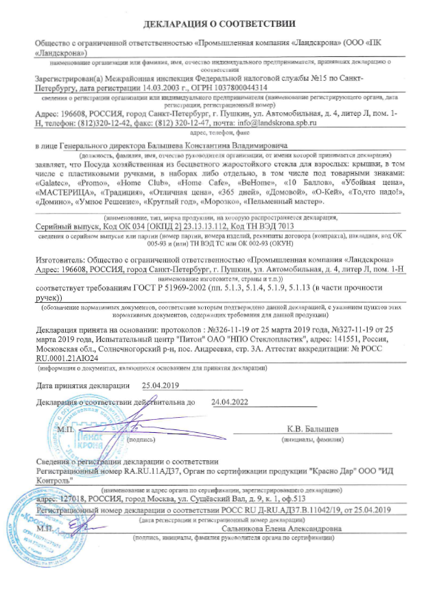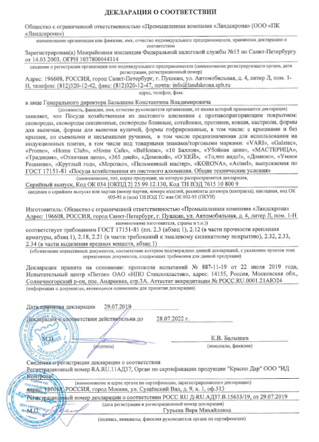 Сертификат соответствия – документ, подтверждающий соответствие продукции требованиям качества и безопасности, установленными для нее действующими стандартами и правилами (ГОСТ, ГОСТ Р, ГОСТ Р МЭК, ТУ, Технический регламент и пр.). Декларация соответствия требованиям качества качества штампованной посуды.