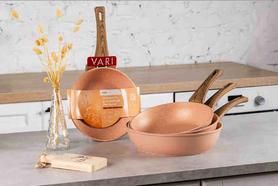 У посуды из этой коллекции трёхслойное антипригарное покрытие на водной основе. Она сделана из пищевого алюминия и подходит для всех типов плит, кроме индукционных.