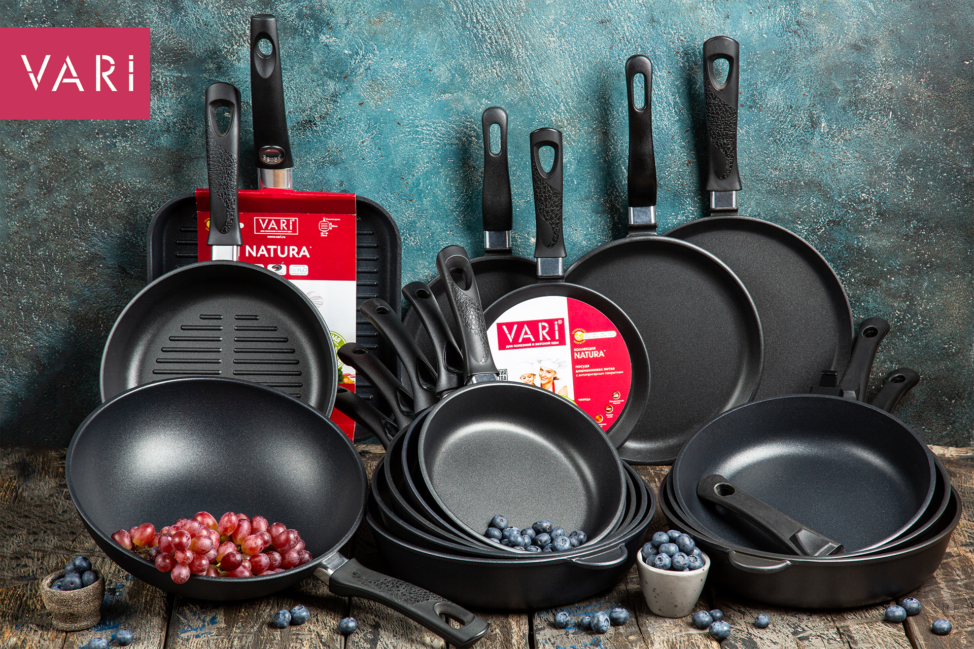Серия литой посуды НАТУРА. Доступная классика, проверенная временем! Антипригарное покрытие Xylan®. Покрытое жаростойким силиконом дно. Толщина изделия дно/стенки до 6/4,5 мм