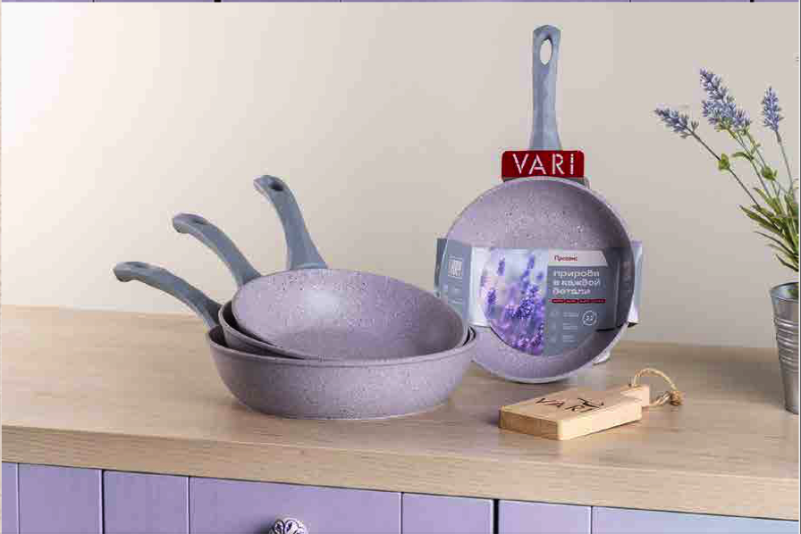 У посуды из этой коллекции трёхслойное антипригарное покрытие на водной основе. Она сделана из пищевого алюминия и подходит для всех типов плит, кроме индукционных.