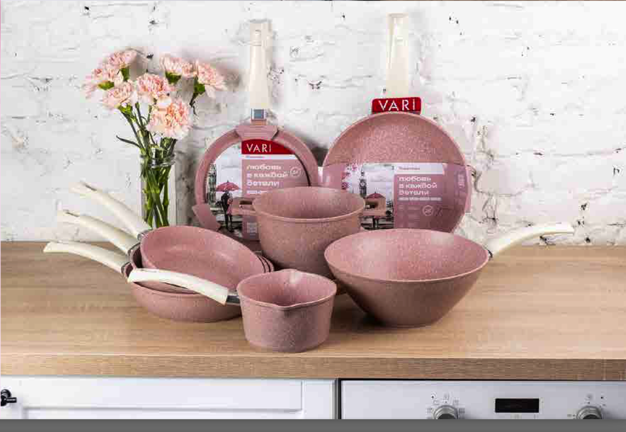 У посуды из этой коллекции трёхслойное антипригарное покрытие на водной основе. Она сделана из пищевого алюминия и подходит для всех типов плит, кроме индукционных.